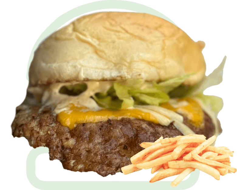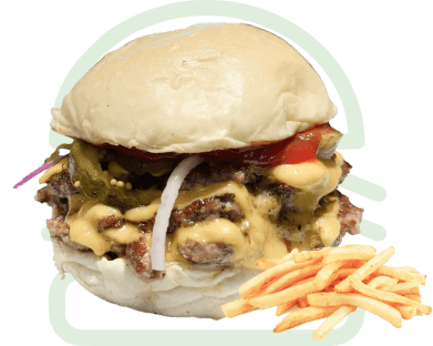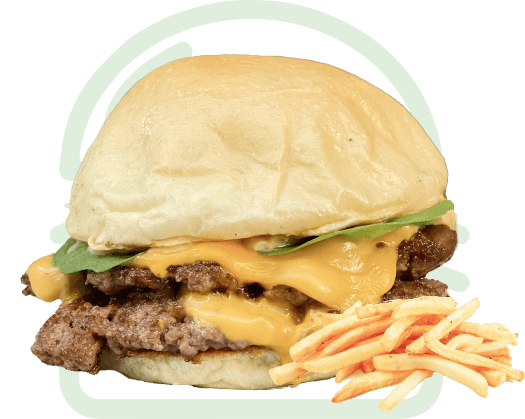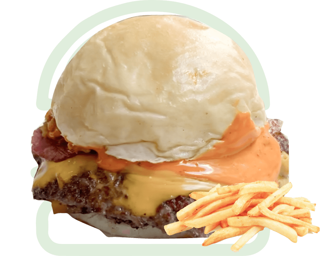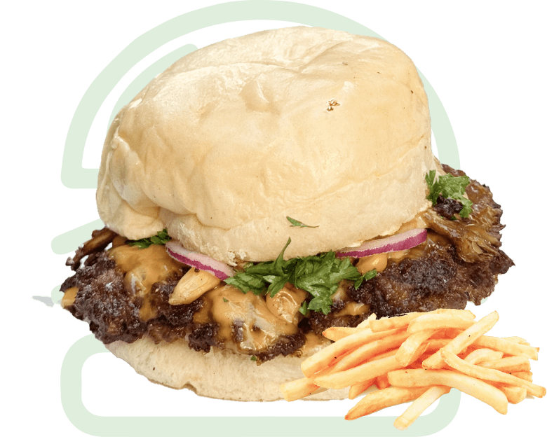 Burger Patty, Smoked Beef Sirloin, Crispy Onion, 2 x Burger Cheese, Slightly Spicy Sauce, Slightly Spiced French Fries
