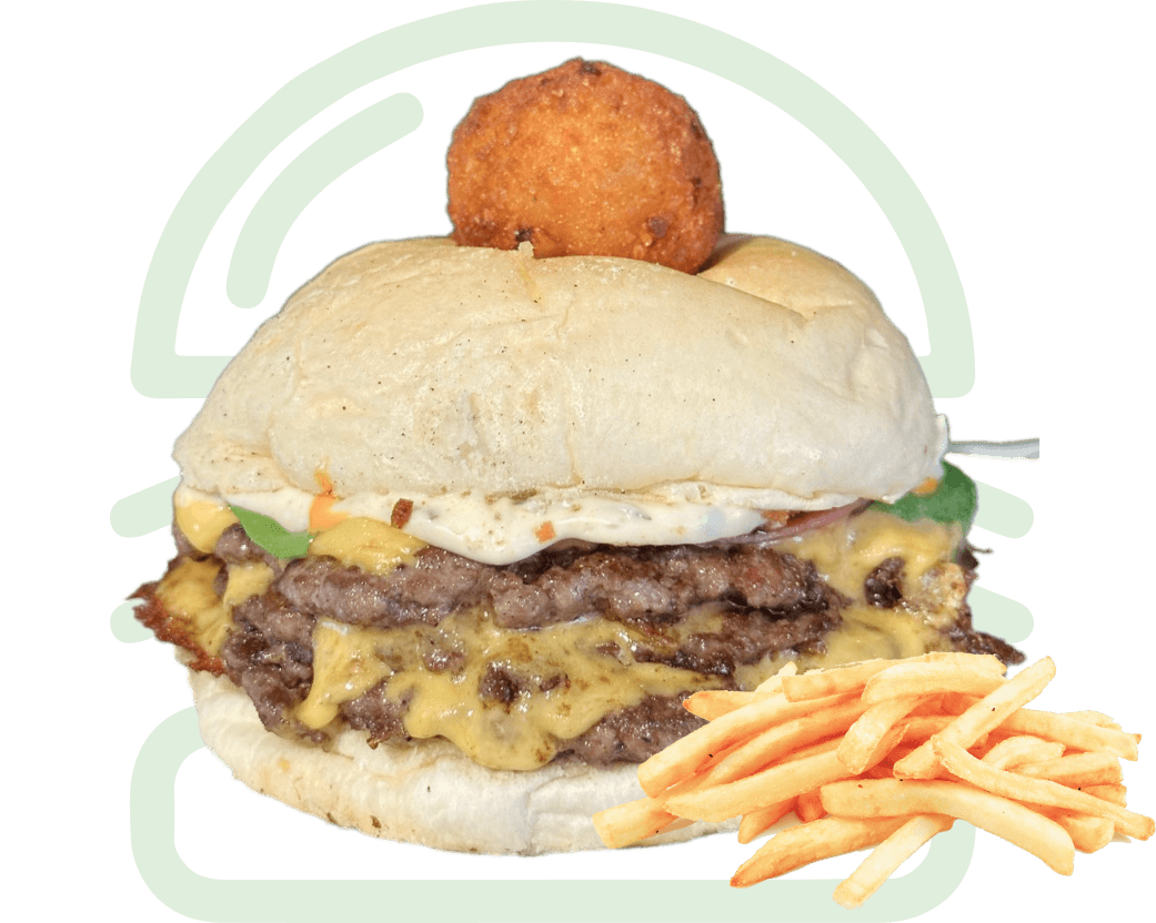 Burger patty, Crispy Onion, Smoked Beef Ribeye, Arugula, 2x Burger Cheese, Special Arca Sauce, Legendary Cheeseball, Slightly Spiced French Fries